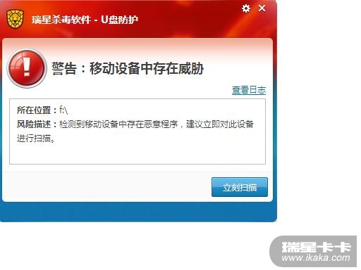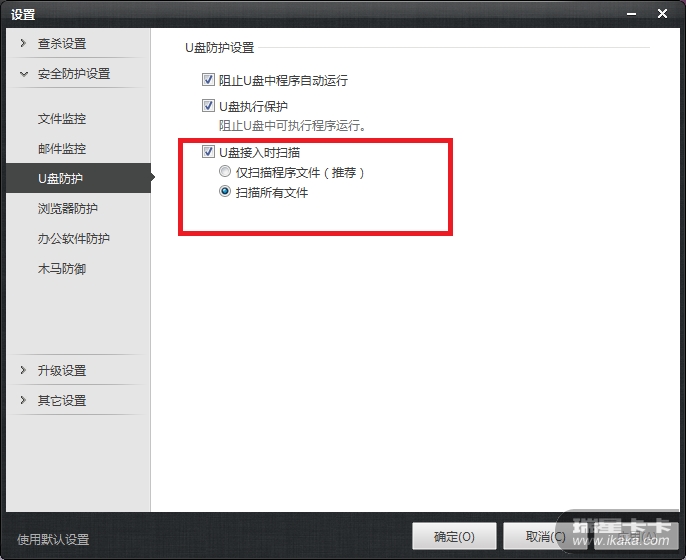 无论红框内选择哪个,当U盘插入时,瑞星杀毒软件2012都没去查杀U盘,日志里没有相关记录。