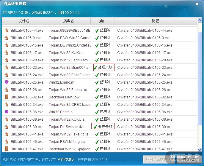 (设置中已去勾扫描一年内病毒),瑞星只删除了20个(虽然显示是23个,但最后查看剩余文件数为30),查杀率20/50=40%。最近瑞星查杀率总是不及格,不知是否是云端服务器调整