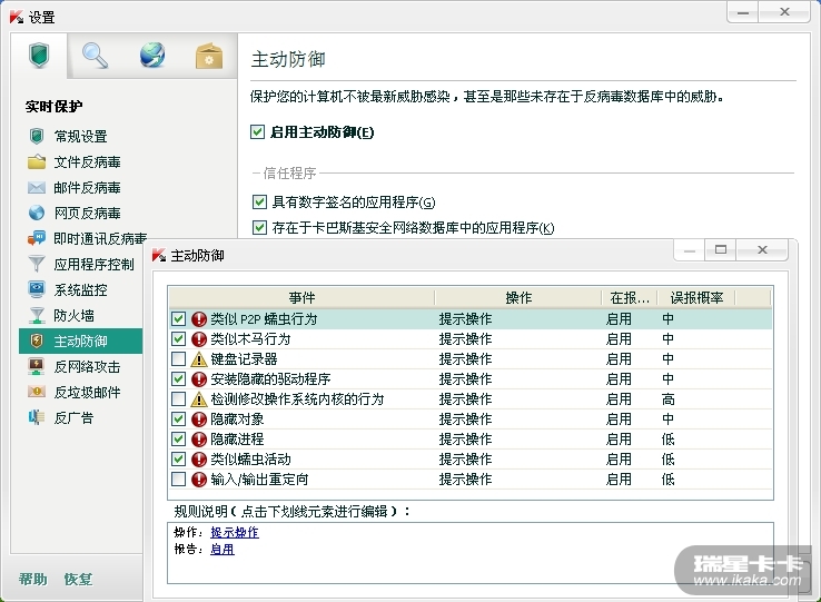 瑞星从2008版引入了主动防御的概念,那时只是超级“阉割”版的hips,09版加强了监控项目,从2010版进入巅峰,真正的行为分析。2011版继续加强了规则,单步hips(系统加固)+多步行为分析主动防御形成了自己的特色。