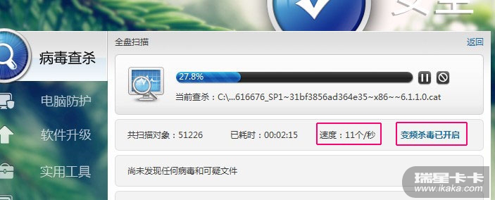 关闭变频后查杀很占系统资源,开启后会根据用户的操作来进行优化查杀。简单理解:如果开启变频,在杀毒的同时在做一些操作时,查杀就会慢,如果什么都不操作就查杀时会快。