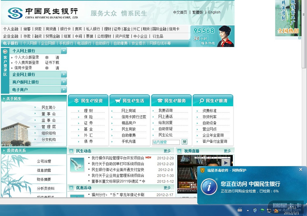 我打开浏览器直接进入民生银行的网站后,瑞星提示网购保护(如图),但我在团购网购物后进入民生银行的页面使用网银付钱时,为什么没有提示?