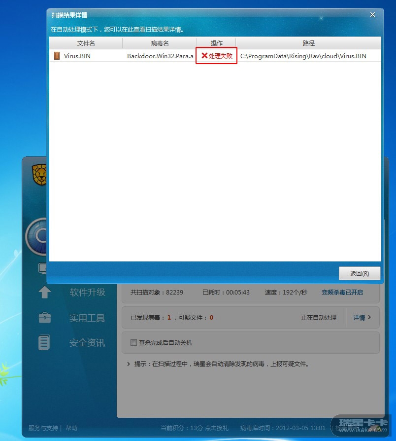 2、还有一个问题,在全盘查杀时发现病毒,我点击瑞星杀毒主界面上的详细后看到“操作”显示为“处理失败”(如图1)但点开日志后看到“结果”又显示“清除”(如图2),有点不太清楚是怎么回事,