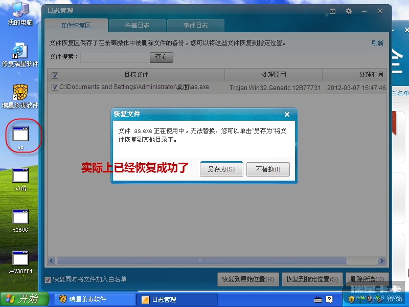 打开瑞星主界面,点“文件恢复区”,选择刚被清除的病毒文件进行恢复,桌面上会出现刚被清除的样本程序,而瑞星却提示文件被占用,如图: