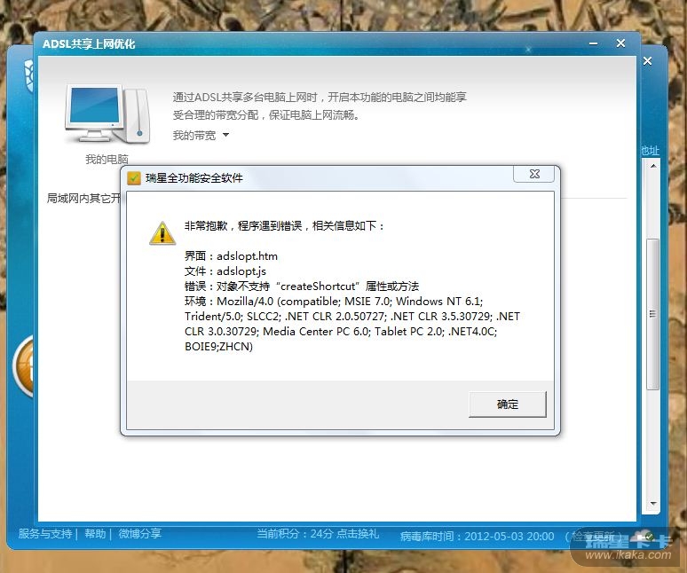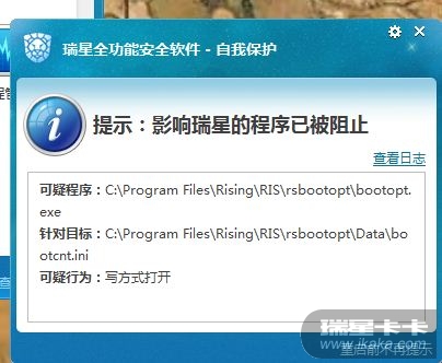 操作瑞星全功能实用工具中痕迹清理、垃圾清理、系统修复、开机优化、ADLS优化时出现上图提示错误。瑞星全功能设置为文件监控流行病毒、启发式扫描、压缩包扫描全选。