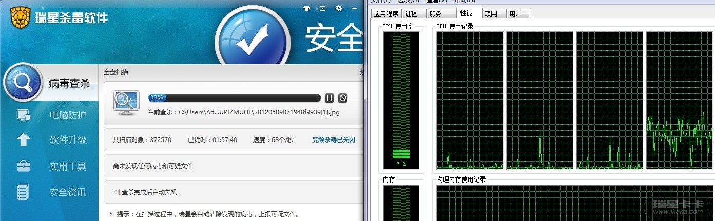 事件:下午下载了瑞星2012公测版,想对电脑进行全面查杀病毒。变频杀毒对系统影响很小,但杀毒很慢。只有十来个文件每秒。关闭变频后变成了一百左右。但无意发现一个问题,杀毒过程中,关闭变频并无其它操作情况下,四核心只有一个核心是工作的。见下图<未“设置相关性”>: