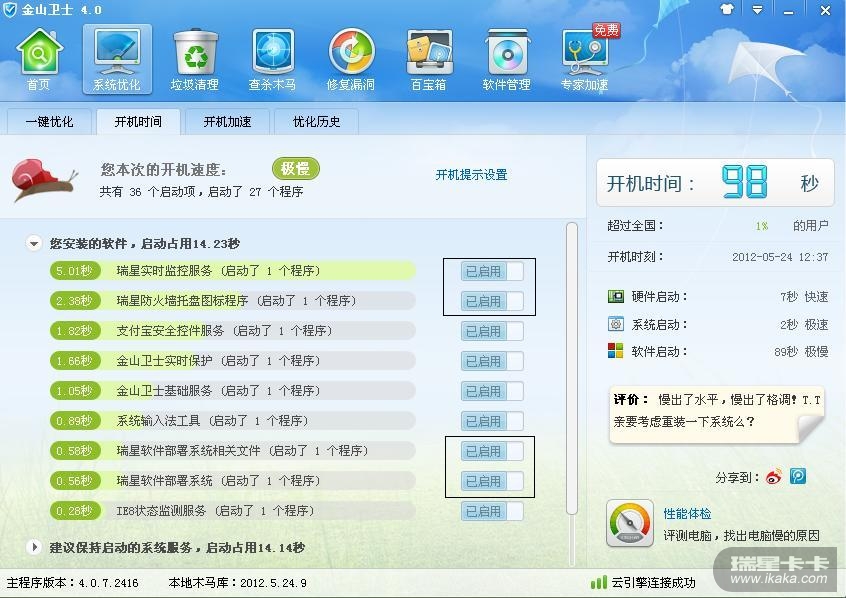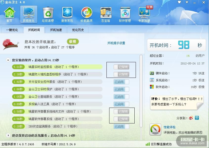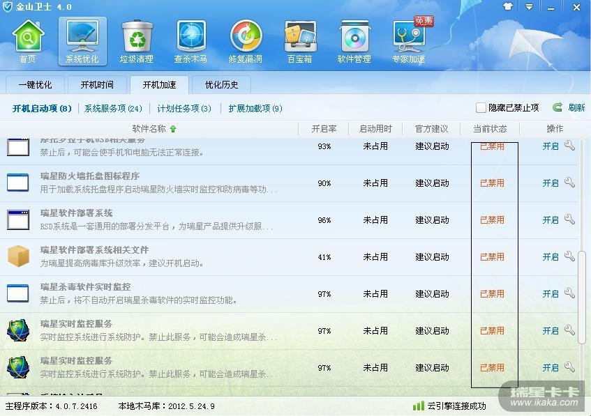 点击开机加速 ,你会看到瑞星相关 已经被禁用!!!