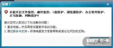 我的瑞星软件出现所有的防护功能全关闭了,提示:1、重启电脑 2、获取服务支持