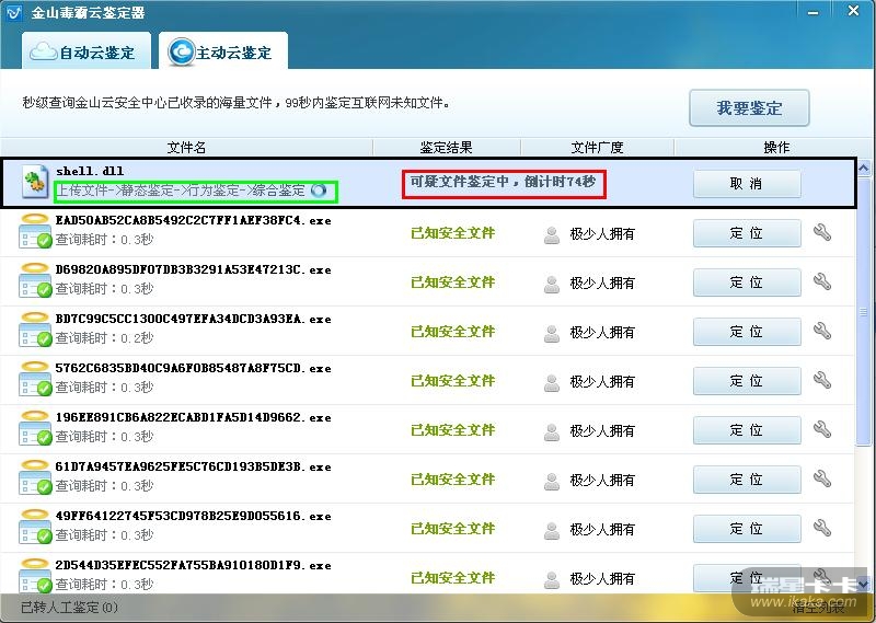 金山 最新版 已经实现了 扫描过程中 碰上未知md5 文件 ,立马 实时 99秒 云鉴定 ,马上出结果!!!