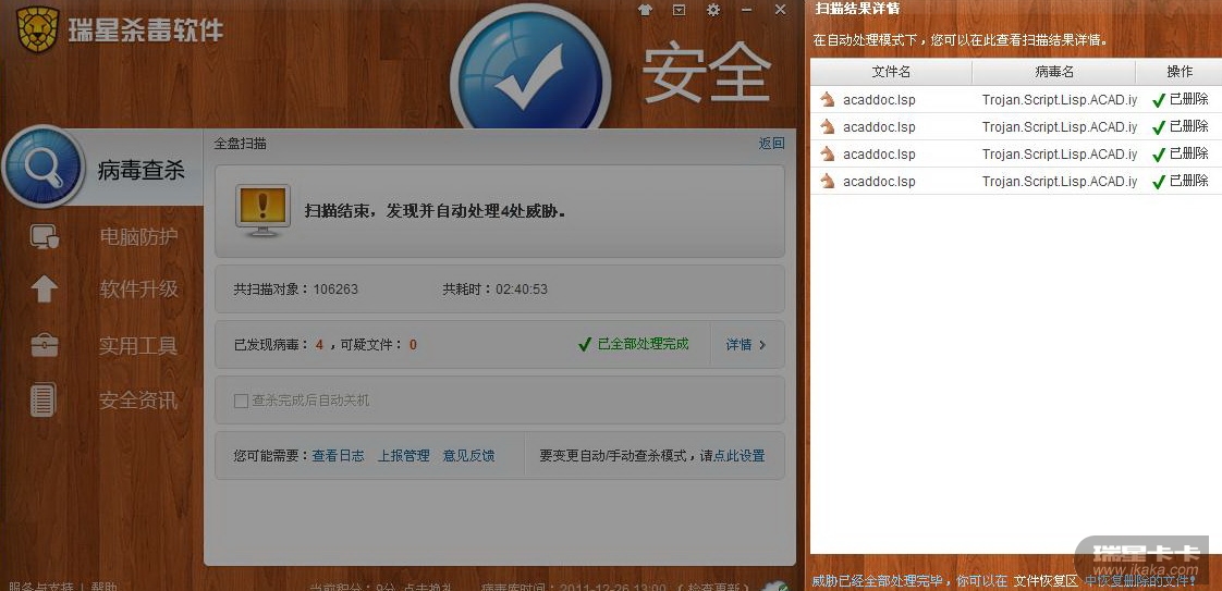 虽然查杀速度较慢,但查杀效果还是比2011的要好,这不2011没查出,2012查出4个CAD病毒