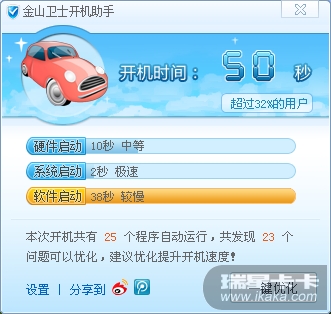 安装瑞星杀毒软件2012后的开机速度: