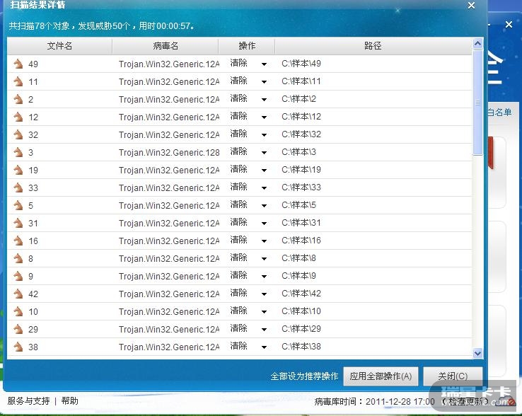 扫描删除了50个,查杀率50/60=83.3%,很不错的成绩!