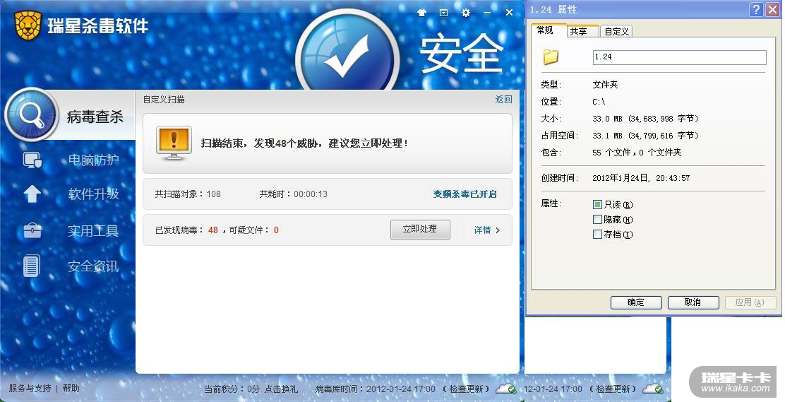 修复后瑞星做联网扫描,结果多发现了1个,证明了云的存在,主要是因为样本少和病毒库的影响所以查杀率提升不是很明显,查杀率51/60=85%