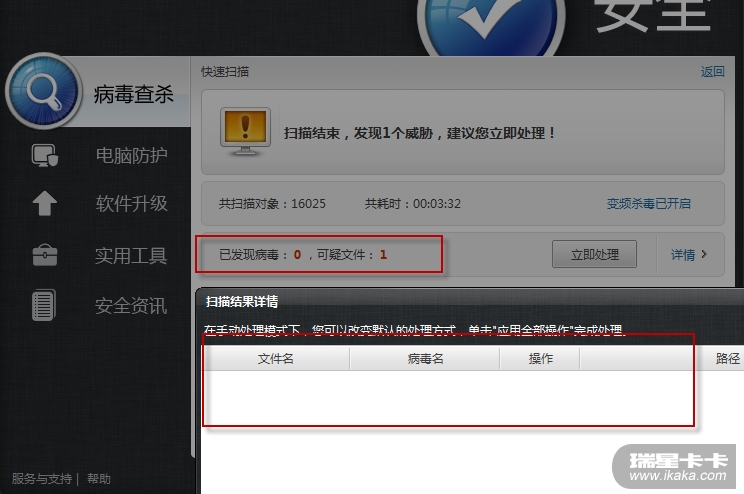 我在进行快速查杀后,有一个可疑文件,并不对病毒处理,长时间将瑞星杀毒软件最小化,结果。。。