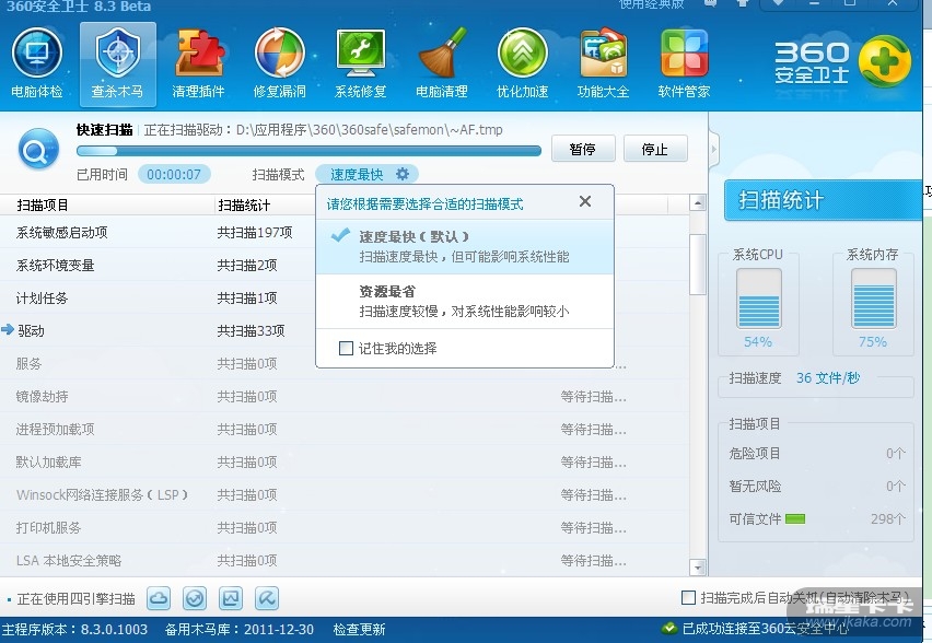 希望在扫描时,增加像360那样的选项节能功能既然是变频,当然应该有个控制扫描速度快慢的功能。还有扫描统计 。。。 这样分清楚看起简洁有清楚楚,
