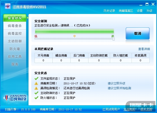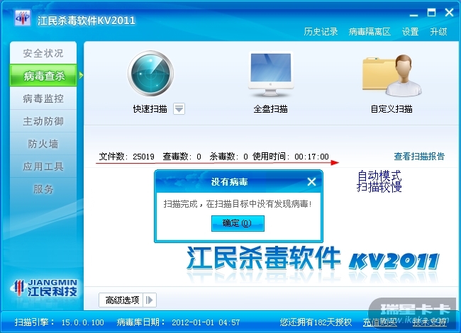 江民没有采用云技术,所以一扫是前三款测试中最慢的17分钟