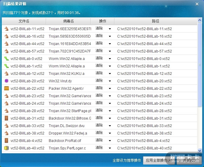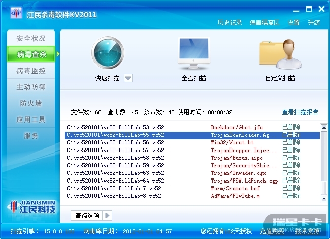 瑞星版本02.27(设置中已去勾扫描一年内病毒),瑞星只删除了27个,查杀率27/66=41%,不及格了 ,应该过节工程师放假了,云端没有入库的原因吧