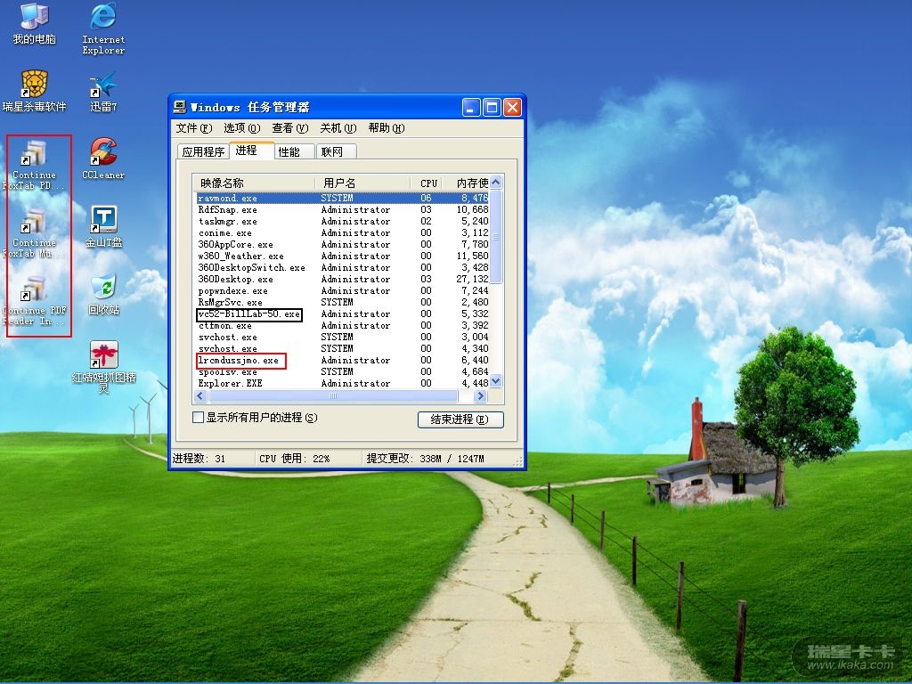 由于虚拟机的内存为512MB,所以看截图资源占用有些高,星星的资源占用一直不错,而江民之前的版本自保强度太大,资源占用一直居高不下。现在的最新版本做了先关优化,降低了自保强度。