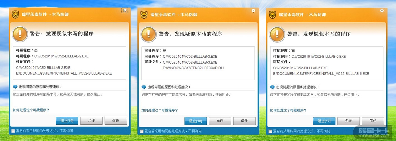 xuetr测试。运行xuetr时,主防弹窗疑似恶意木马,但阻止后程序依然正常加载,后面该发生的就都发生了,瑞星全部进程被干掉了。