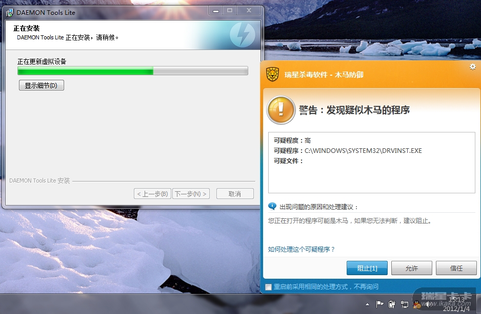 安装虚拟光驱Daemon Tools Lite时发生误报。