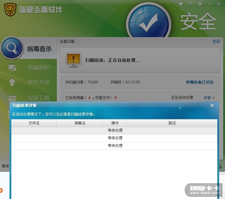我在14:45分左右就全盘查杀完毕了,并且在关闭界面时,已经点击了自动处理了.现在是15:32,打开主界面,居然还提示正在处理..