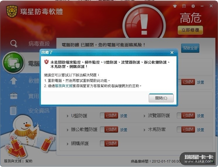 我重啟電腦都不能開啟瑞星殺毒軟件2012的電腦保護呢~?!