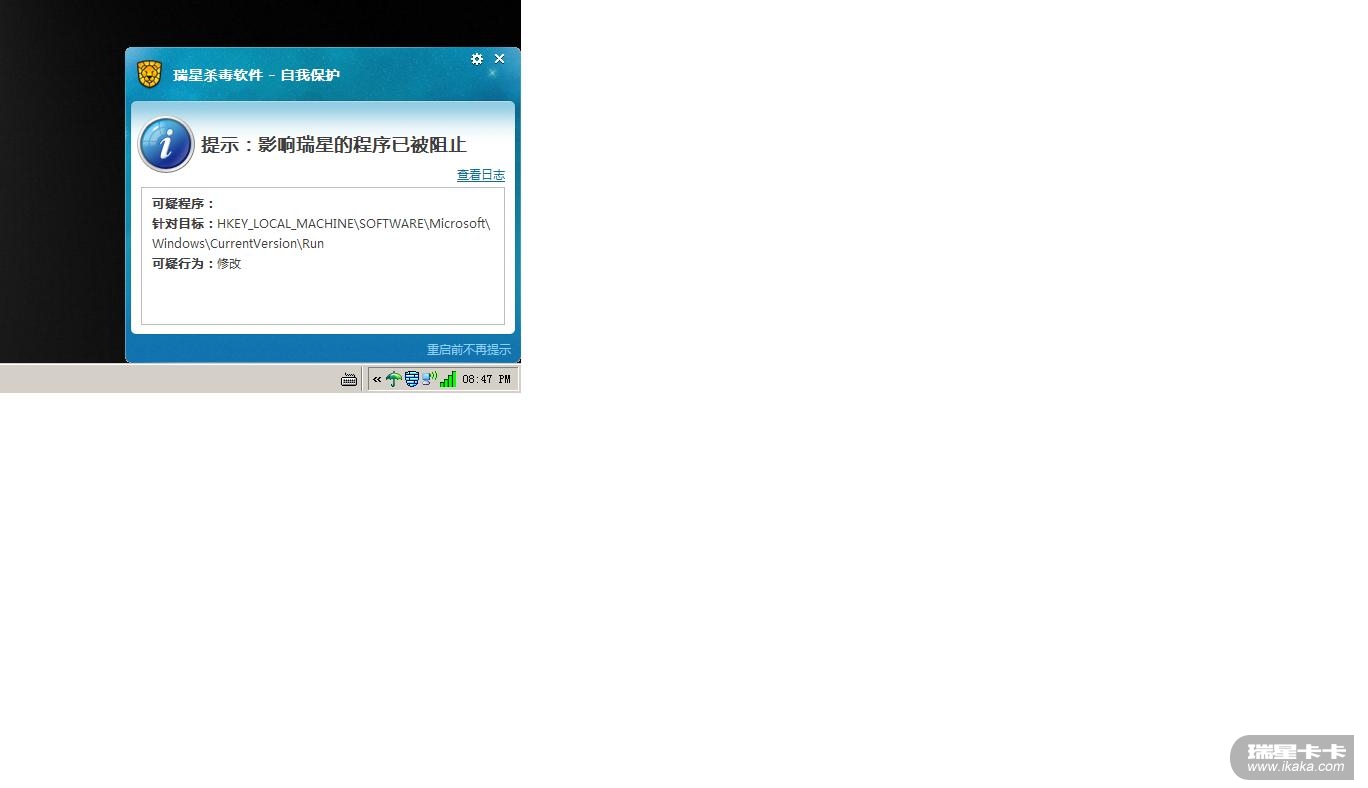 关闭“瑞星注册表修复工具”时,瑞星杀毒软件弹出自我保护,并提示“影响瑞星的程序已被阻止”(如图)