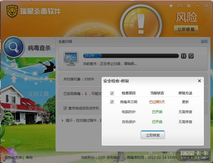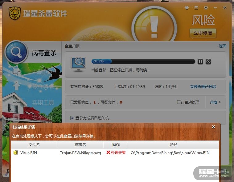 杀毒时无法退出,而且速度超慢,每秒一个,而且无法关闭,瑞星失去响应。