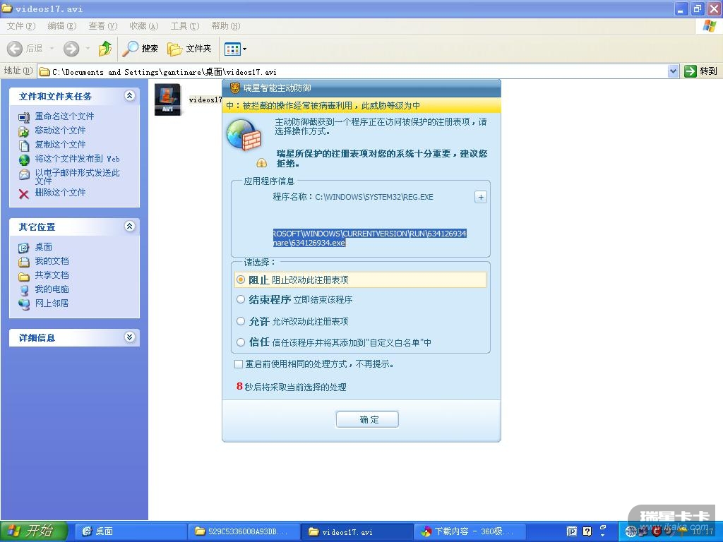 如果放行添加启动项,就只有在安全模式下删除位于C:\Documents and Settings\****的生成物