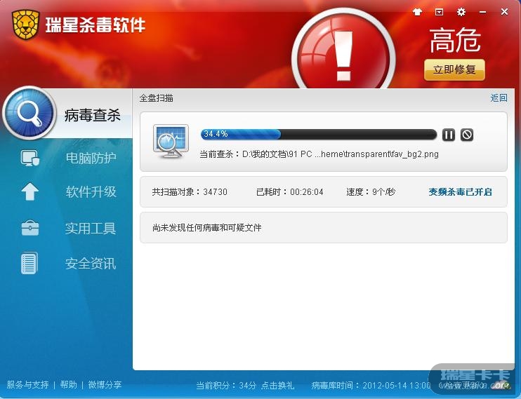 若用户需要全盘扫描时,瑞星再开足马力!!!