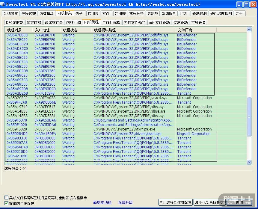与腾讯和bt 相比 ,瑞星的 内核线程 少的可怜!!!
