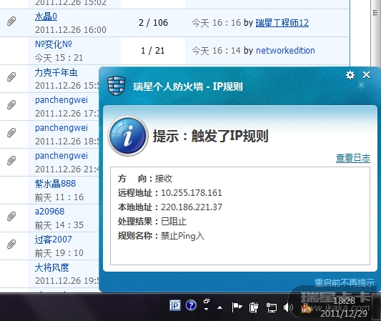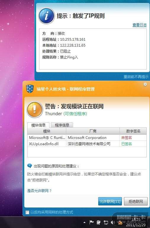 打开迅雷后,防火墙还是一直弹出“触发了IP规则”,没玩没了。这个问题没解决,另外,弹出的提示框不会自动关闭,必须手动点击关闭。