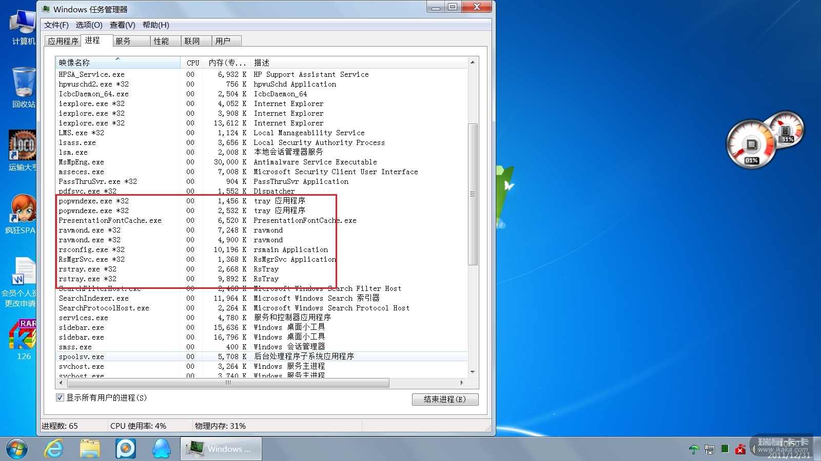 然后我就猛点开始菜单的RFW主程序,结果后台出现4、5个主程序进程,就是不见防火墙主页面跳出来,也不见托盘
