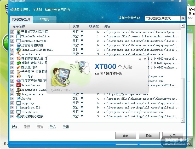 因为有朋友电脑有故障,通过QQ远程,发现很卡,几乎不能操作。所以传了一个XT800给他。当我本机安装完XT800之后,发现防火墙提示应用程序访问网络(XT800主程序)。