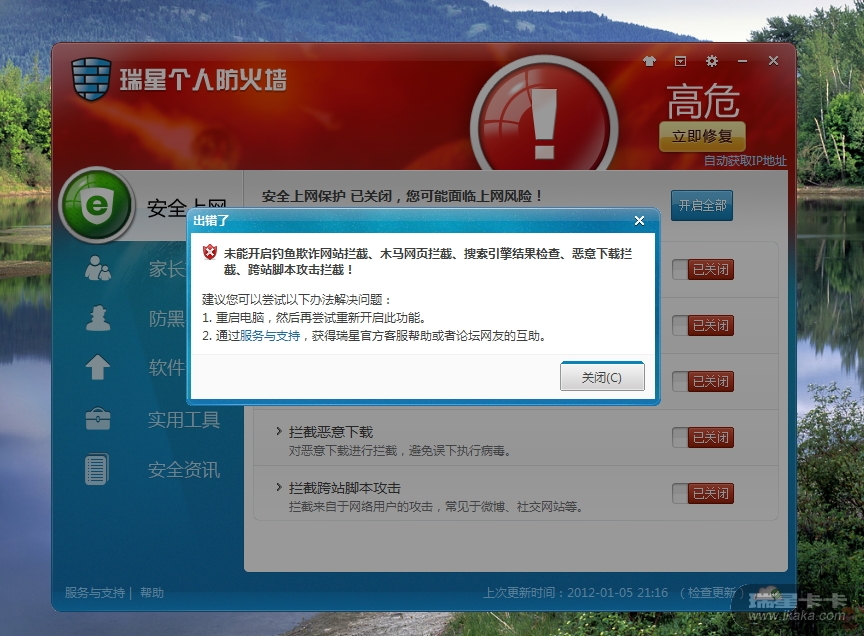 开始--程序--瑞星个人防火墙--修复--下一步,把保留用户配置文件的勾选去掉--下一步,修复防火墙之后就悲剧了.........