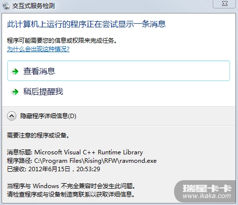 刚装好瑞星杀软和个人防火墙时系统老是提示有“交互式服务”信息,后来禁用了系统的交互式服务后不再有提示。过没多久防火墙的“安全上网”和杀软的“文件监控”