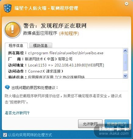 新浪微博桌面应用程序联网时,防火墙显示为“未知程序”