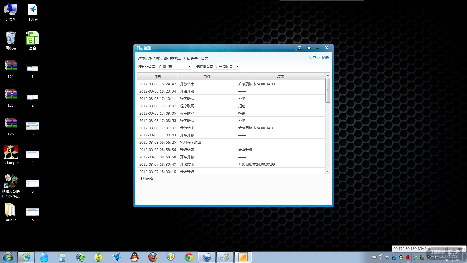 防火墙开始检测到威胁了,从我参加测试,从第一个测试版到今天为止,W7系统下我就没见过托盘报警,那红灯一闪一闪的,那不成以前就一直没有工作?