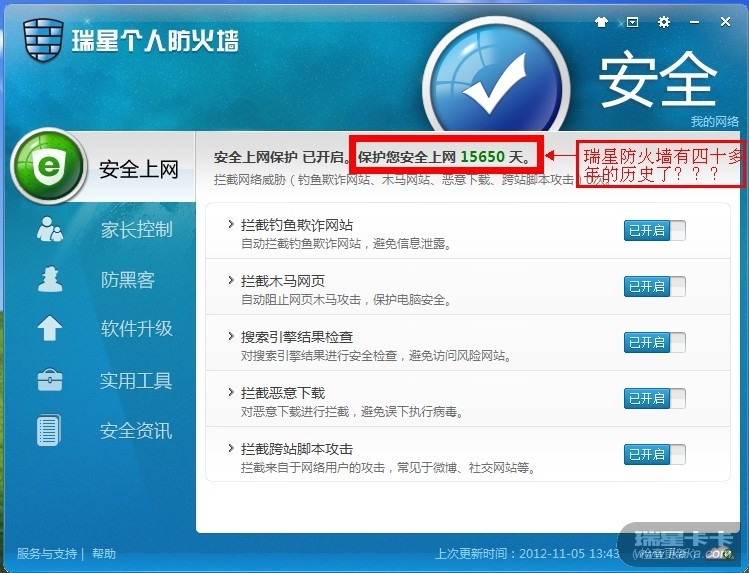 重新安装瑞星防火墙2012,发现下图这个情况,“保护您安全上网15650天”,比我年龄还大,元芳,你怎么看?
