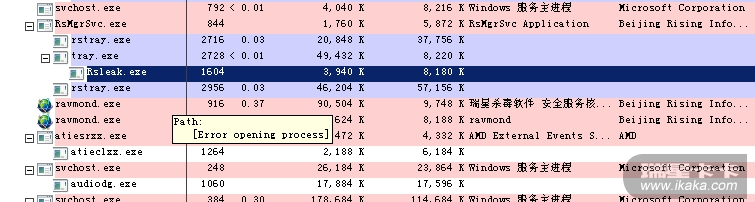如图,有进程,无托盘。进程路径显示错误path:error opening process。