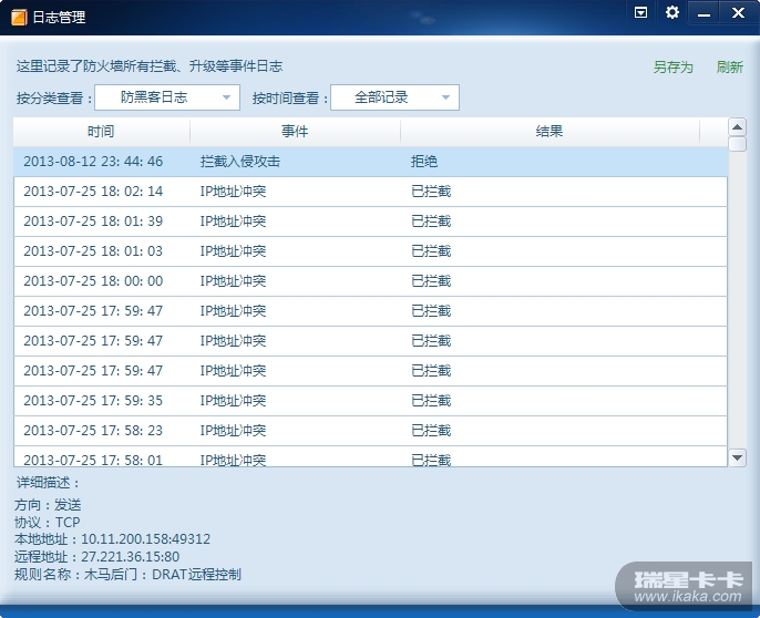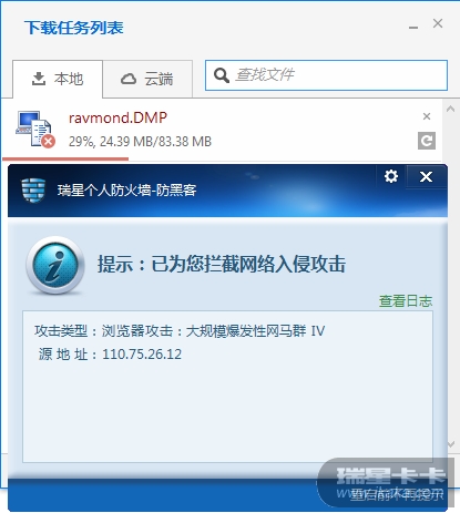 【2】另外,我开百度云管家上传上面的dump文件到百度网盘的时候,防火墙误报该操作为DRAT网络入侵并拦截,所以上传不上去只能传到淘宝云盘里了。