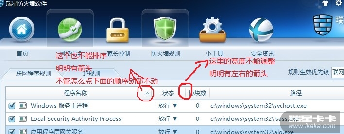 箭头图标已经取消了。界面宽度已经可以调整了,请把瑞星个人防火墙升级至最新版试试。