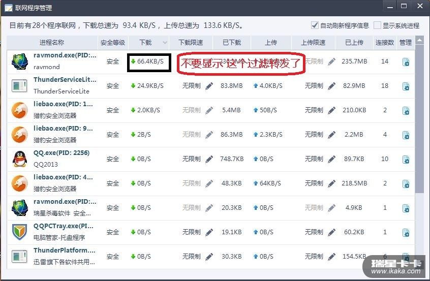 建议不显示 瑞星过滤的  网速占用