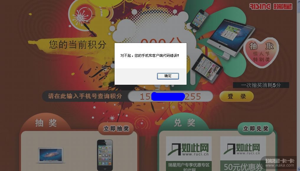 瑞星5000万豪礼回馈用户活动抽奖跳出对不起,您的手机和客户端代码错误!