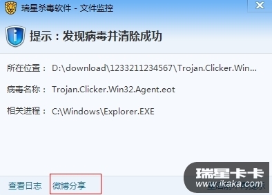 目前只有文件监控弹窗有微博分享功能。全盘杀毒没有微博分享功能。例如下图: