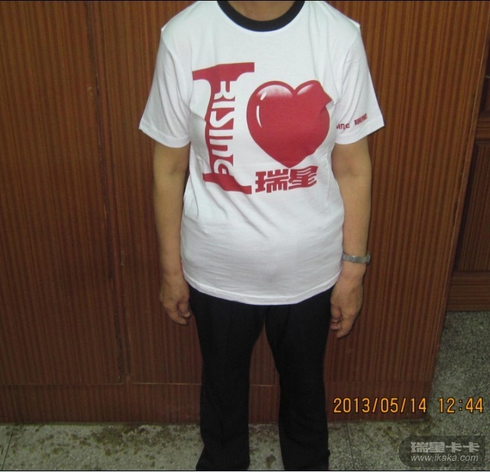 我一直打算送我妈妈一件瑞星T恤,盼望几个月了,恰好前天星期天是母亲节,我就把瑞星T恤作为礼物送给我妈妈了。我妈妈昨天不在家,今天上午回家,中午穿上瑞星T恤来个真人秀。