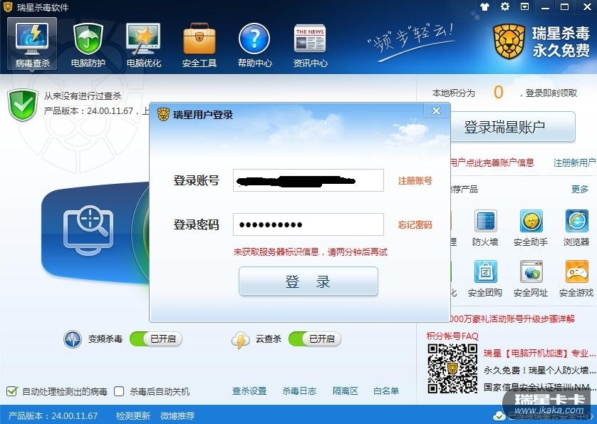 您好!这个问题,我也遇到过,重启之后、或过几分钟之后,应该就好了!遇到这个问题的原因,可能是瑞星系统还没有反应过来,一般是刚刚安装瑞星杀毒、或卸载之后重新安装的时候,马上登录账户,会这样的提示!仅供参考!