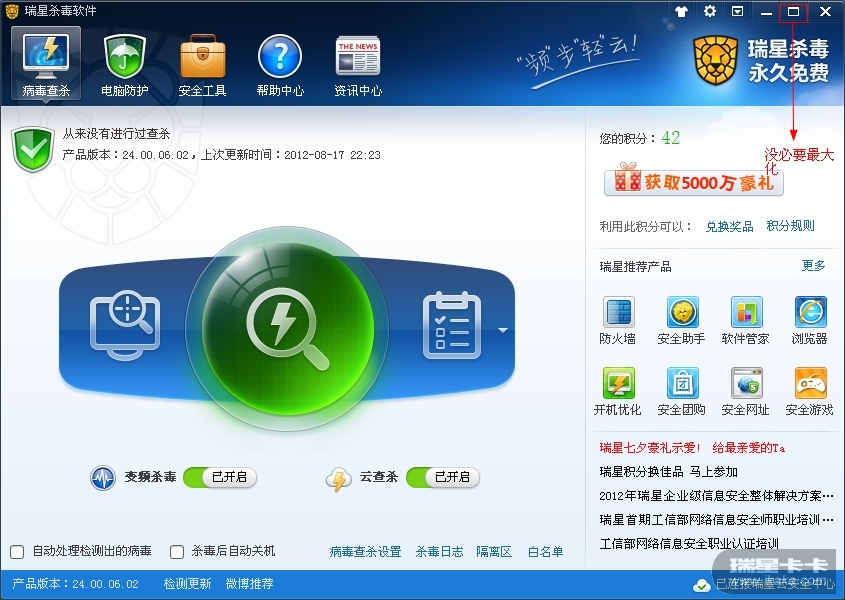 另外最大化按钮这个怎么又加进来了???有谁没事会把杀毒软件全屏显示???2010、2011、2012第一版都没有这个最大化,V16