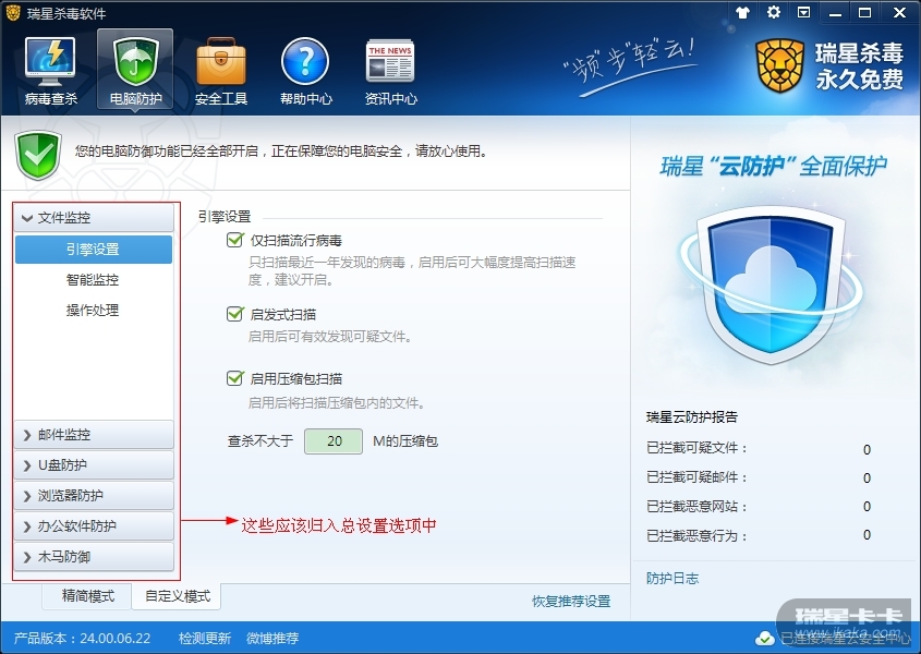 安装包制作的安装程序暂不支持一键安装,监控及其他功能设置应该归入总设置中,这个目前界面设计如此。其余建议已收集反馈,感谢试用瑞星v16。