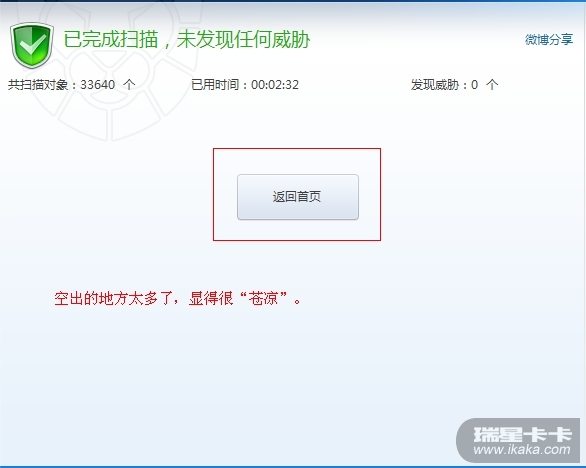 这样做一方面充分利用了页面空间,另一方面可以让用户对本次扫描的概况有一个大致了解,直接提示一个没有发现威胁给人敷衍了事