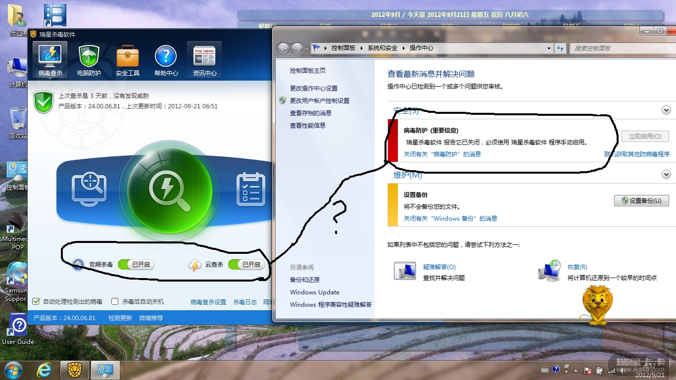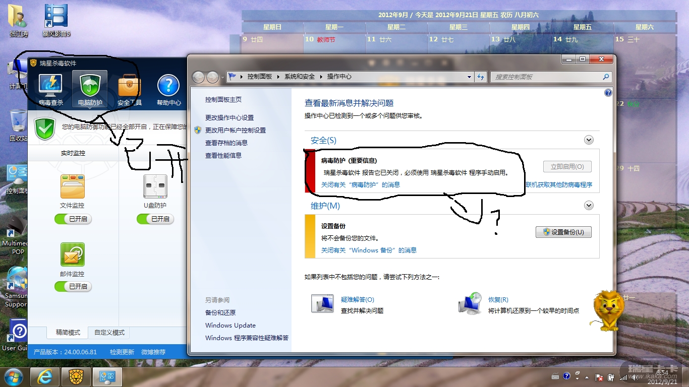 今天是安装瑞星杀毒第四天,出现一个重大问题。见下图:(电脑报瑞星杀毒已关闭,瑞星显示一切正常)
